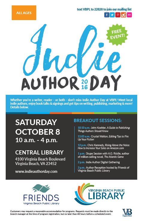 Saturday, October 8th is Indie Author Day 2016 at the Virginia Beach Central library. Meet me and other local indie authors, enjoy book talks and signings, and get tips on writing, publishing, marketing, and more! Come on out and get your signed copy of Gypsy Spy!