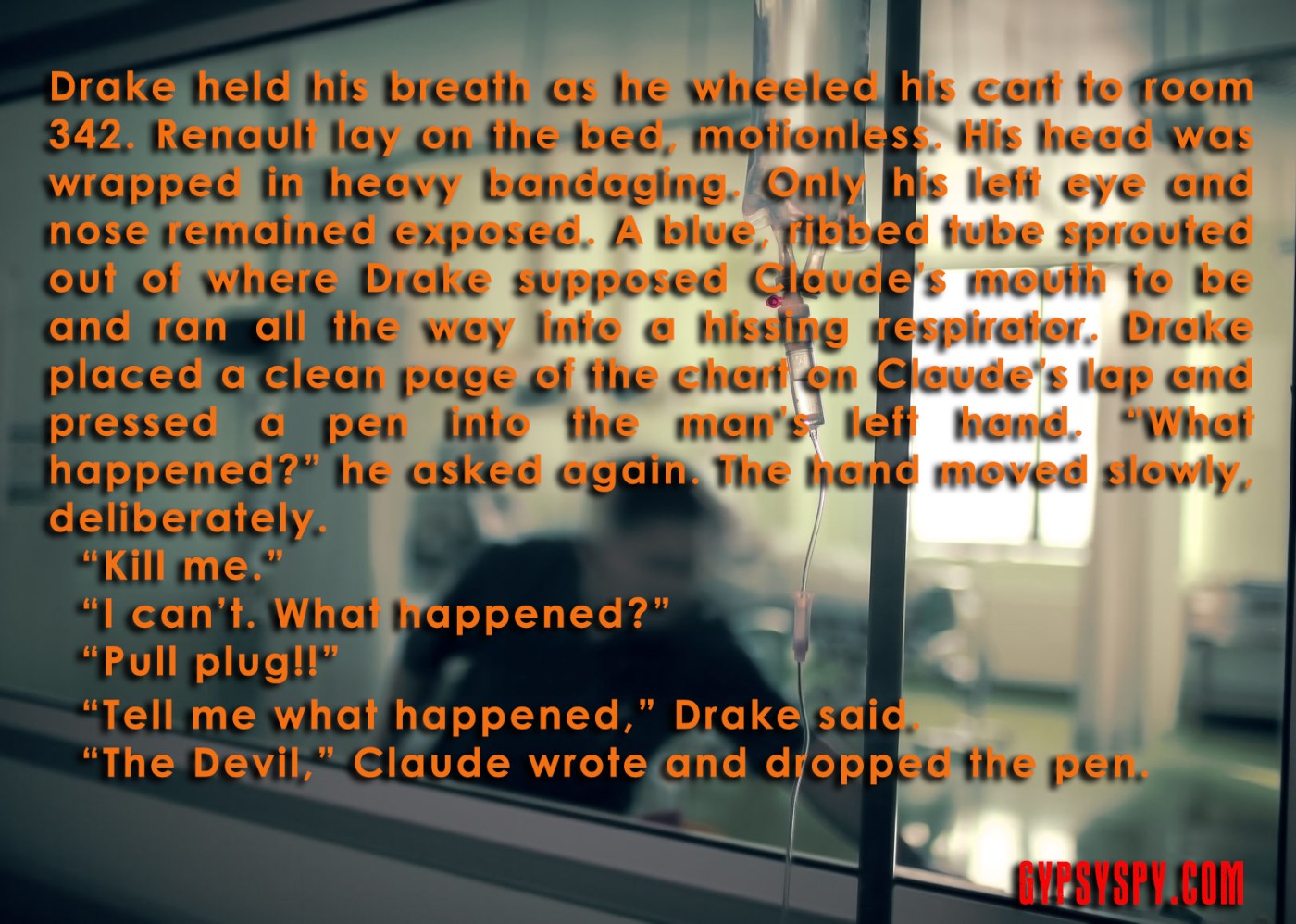 “The Devil? Who?” Drake asked. In a swift motion, Claude jabbed the pen into his respirator line and pulled it out. The hiss grew louder. “Crap,” Drake said and placed his hand over the hole. It was no use. Claude’s left eye bulged slightly as his brain fought against his mind for life and tried to find air. A monotone replaced the background blip in the room. Drake looked up at the heart monitor. Flat line. Cursing, Drake slapped the blue button above the headboard.